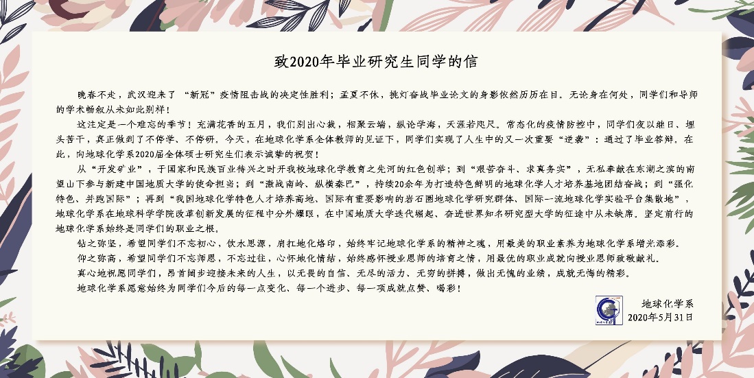 “成才首在成人,育人贵在育心。疫情防控下的云端答辩,让同学们在永存这一特殊答辩形式记忆的同时,或多或少留下了一些不能面对面交流的遗憾。在答辩过程中,我们严格按规范流程组织,维护答辩的严肃性。寄语莘莘学子,是为了进一步增强同学们答辩的仪式感,这既是对他们的美好祝愿,更是对他们的殷切嘱托。希望他们不忘根基、心怀感恩、坚定理想,为新时代地化精神再添荣光。这也是地球化学系一直倡导的育人传统”,地球化学系党支部书记刘金铃副教授如是说。