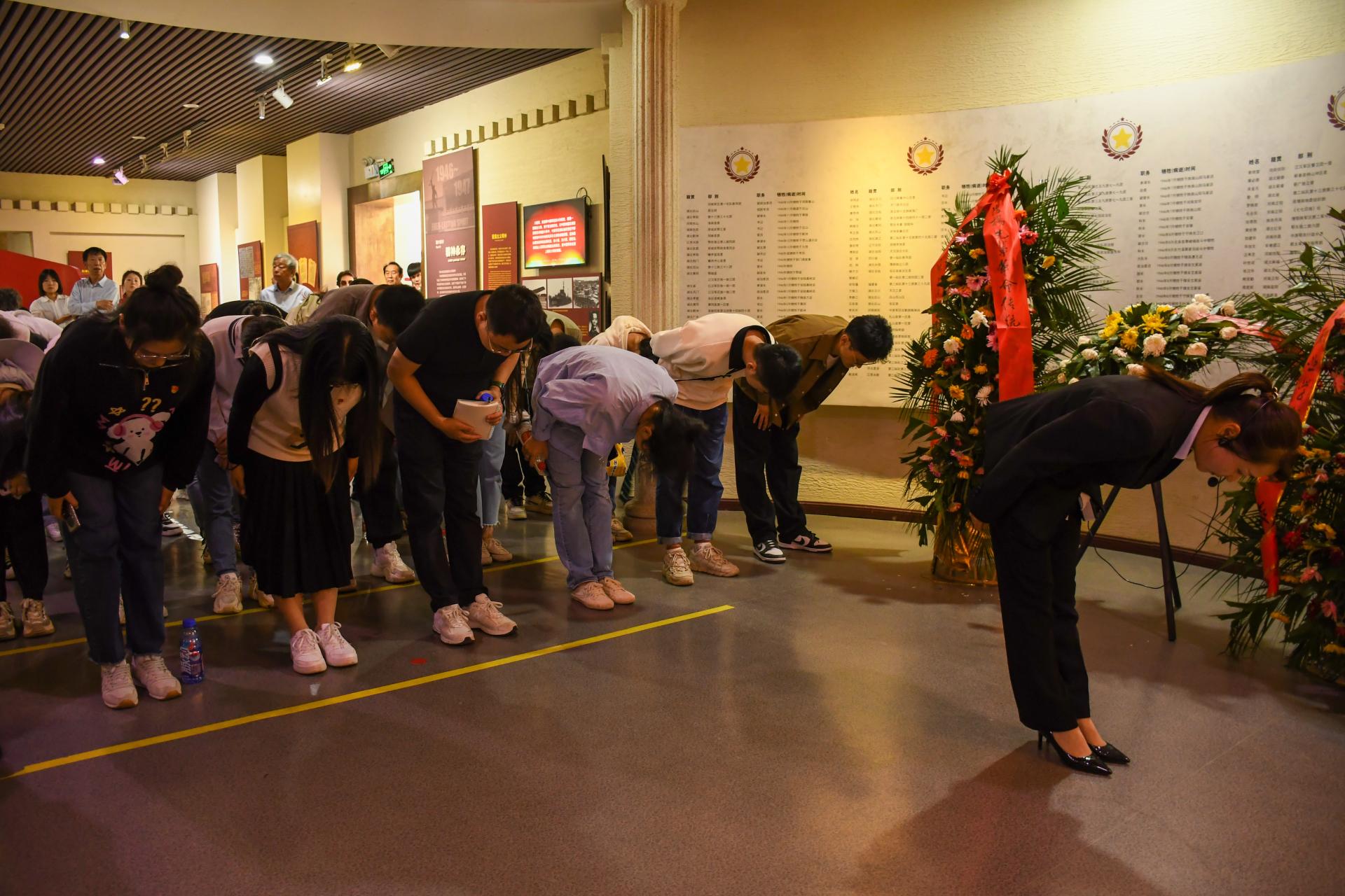 师生们向革命先烈三鞠躬表达敬意。结束纪念馆的学习参观,师生们来到周恩来与美、蒋代表谈判旧址。这里陈列着当时三方谈判代表的席位及有关图片和文字资料,展厅中的历史资料越过时空,陈述着这次谈判具有的重要历史意义,正是在这里,周恩来、李先念于1946年与美、蒋代表进行谈判,挫败了国民党的军事进攻阴谋。