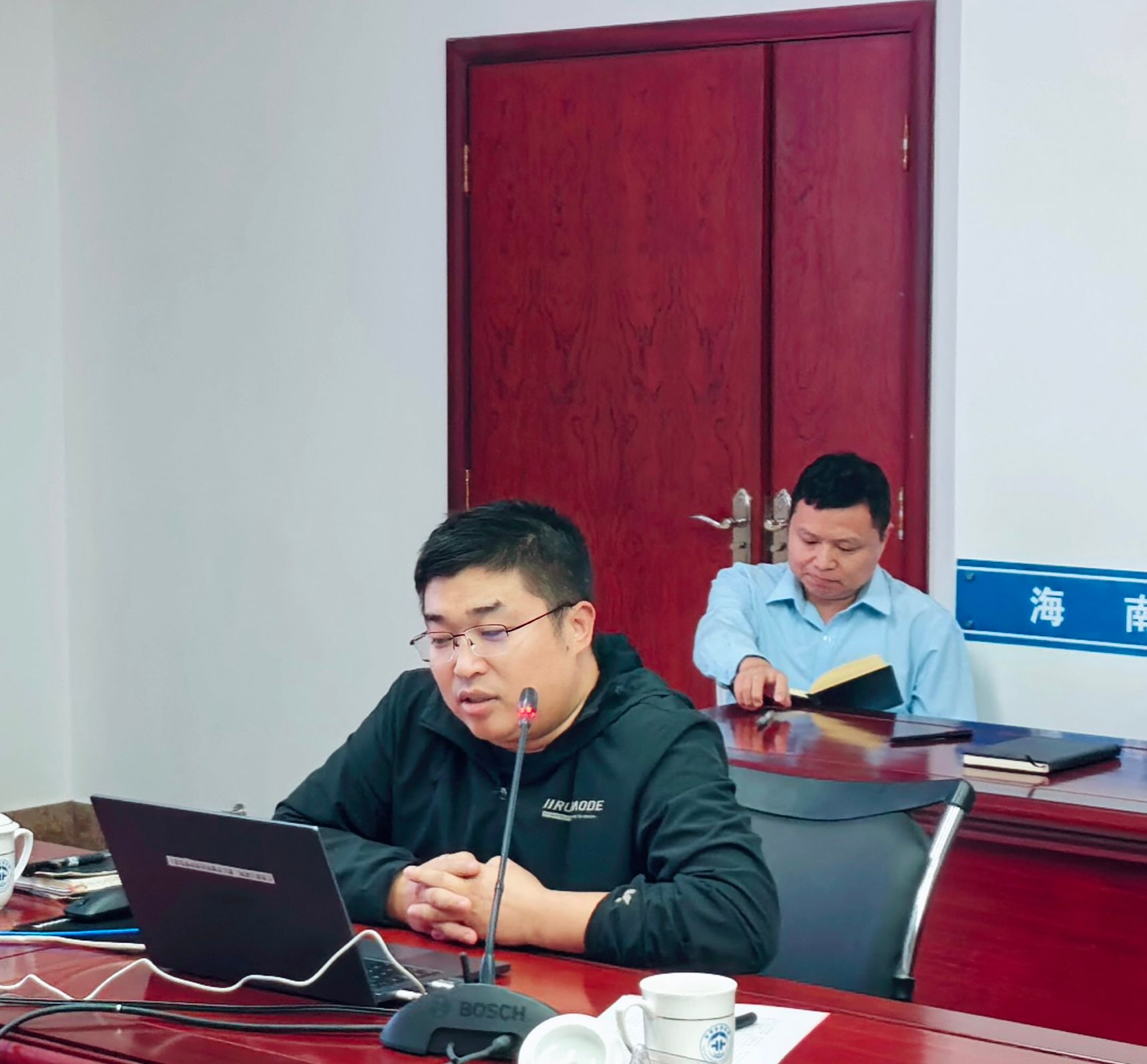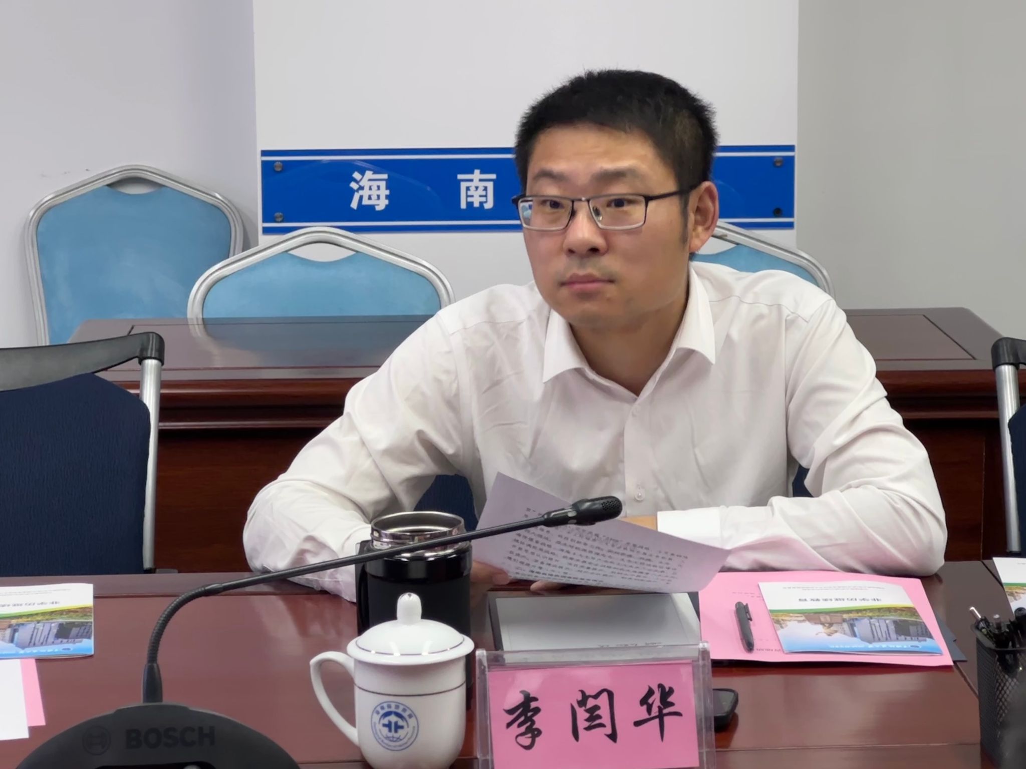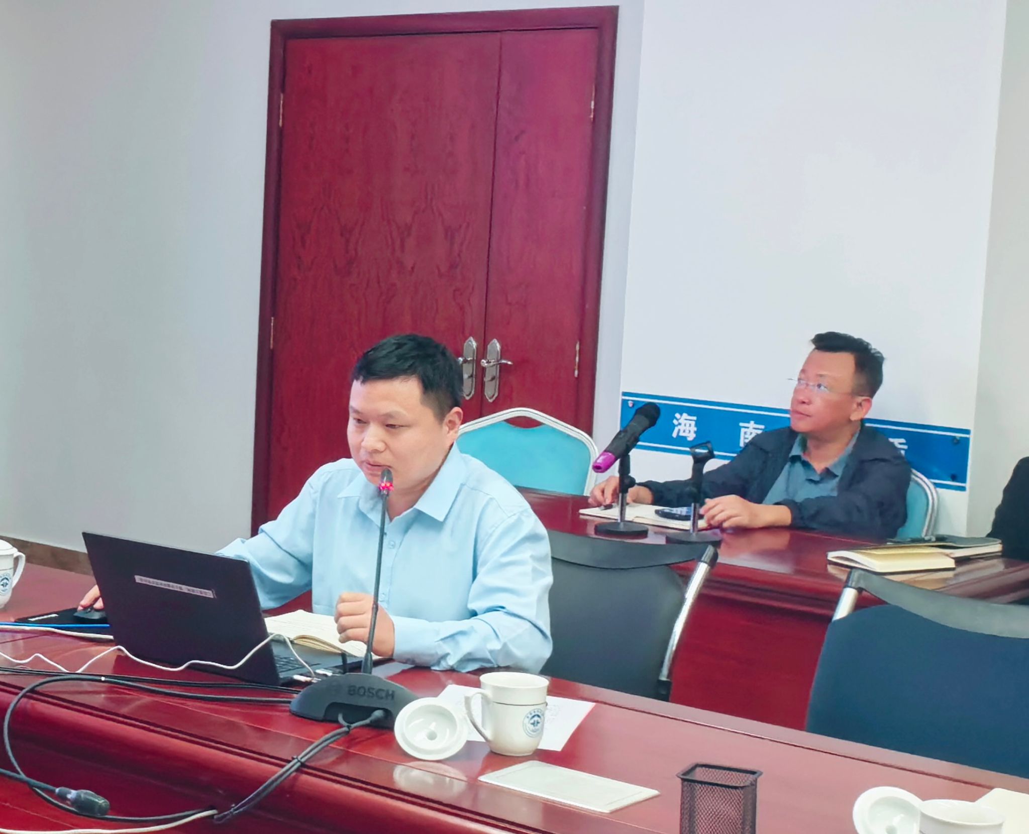 与会人员观看了海南省地质局宣传片,李闫华副局长对学院的来访表示热烈欢迎,并详细介绍了海南省地质局的发展历史、人员队伍、产业结构和科研方向,期待通过产学研合作,为新一轮找矿突破战略行动和地方经济发展提供更强科技与人才支撑的期望。佘振兵副院长介绍了学院的整体情况、科研优势与特色。他表示,希望以此次交流为契机,加强双方在在人才培养、科技创新等领域的合作,实现优势互补、共同发展。