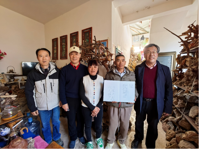 龚一鸣教授(左一)、冯庆来教授(左二)、童金南教授(右一)为施甸化石爱好者段明华夫妇题字并赠书