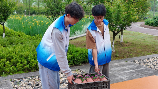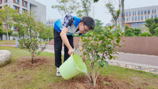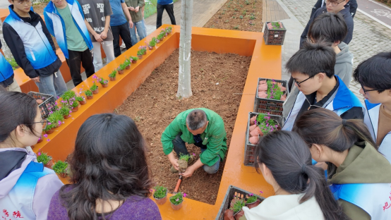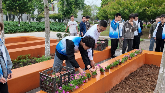 活动接近尾声之际,管理人员和志愿者们也不忘清理现场,未来城校区管理办公室叶传钟老师用水枪轻柔地冲洗着泥土,志愿者们拿着抹布擦拭台面,大家都有着明确分工,将剩余的花苗整齐的摆放进收纳篮里并搬上了车。不一会儿,冲洗去泥土后的花坛,整洁亮丽,绽放的花朵让这片土地洋溢着生机,愿未来这些花朵和树苗都能茁壮成长,成为一道别样的风景。
