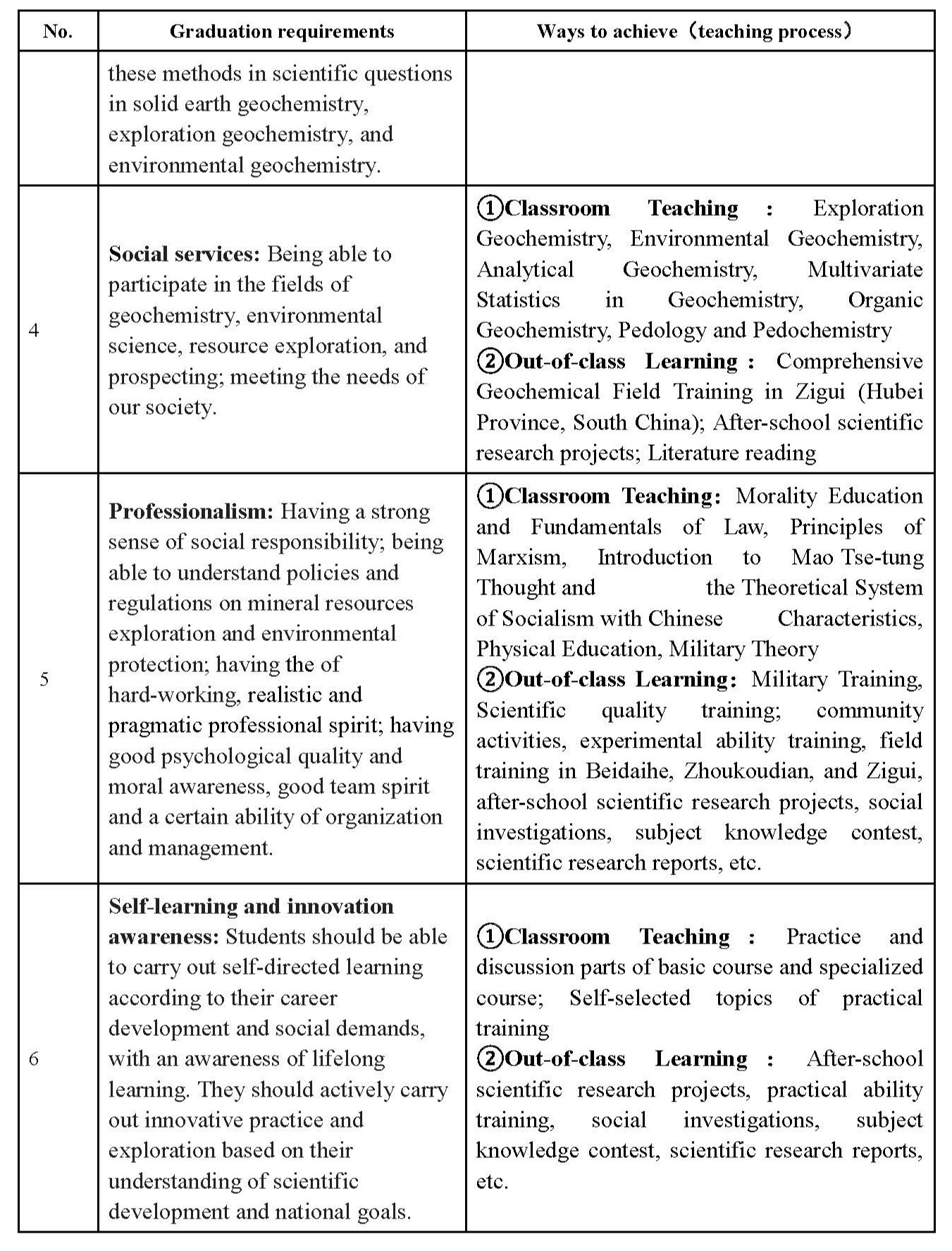 5. Professionalism: Having a strong sense of social responsibility; being able to understand policies and regulations on mineral resources exploration and environmental protection; having the of hard-working, realistic and pragmatic professional spirit; having good psychological quality and moral awareness, good team spirit and a certain ability of organization and management.