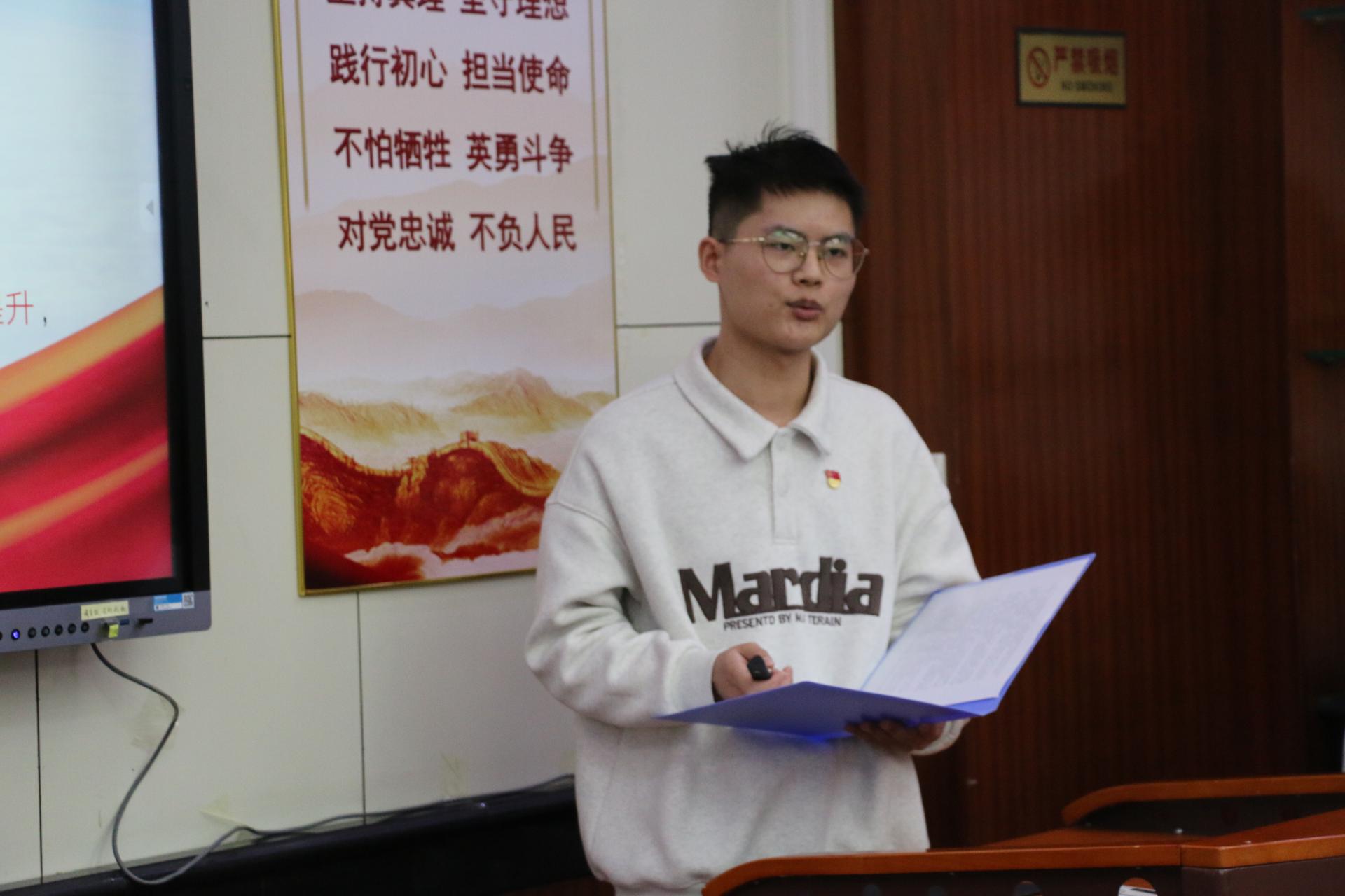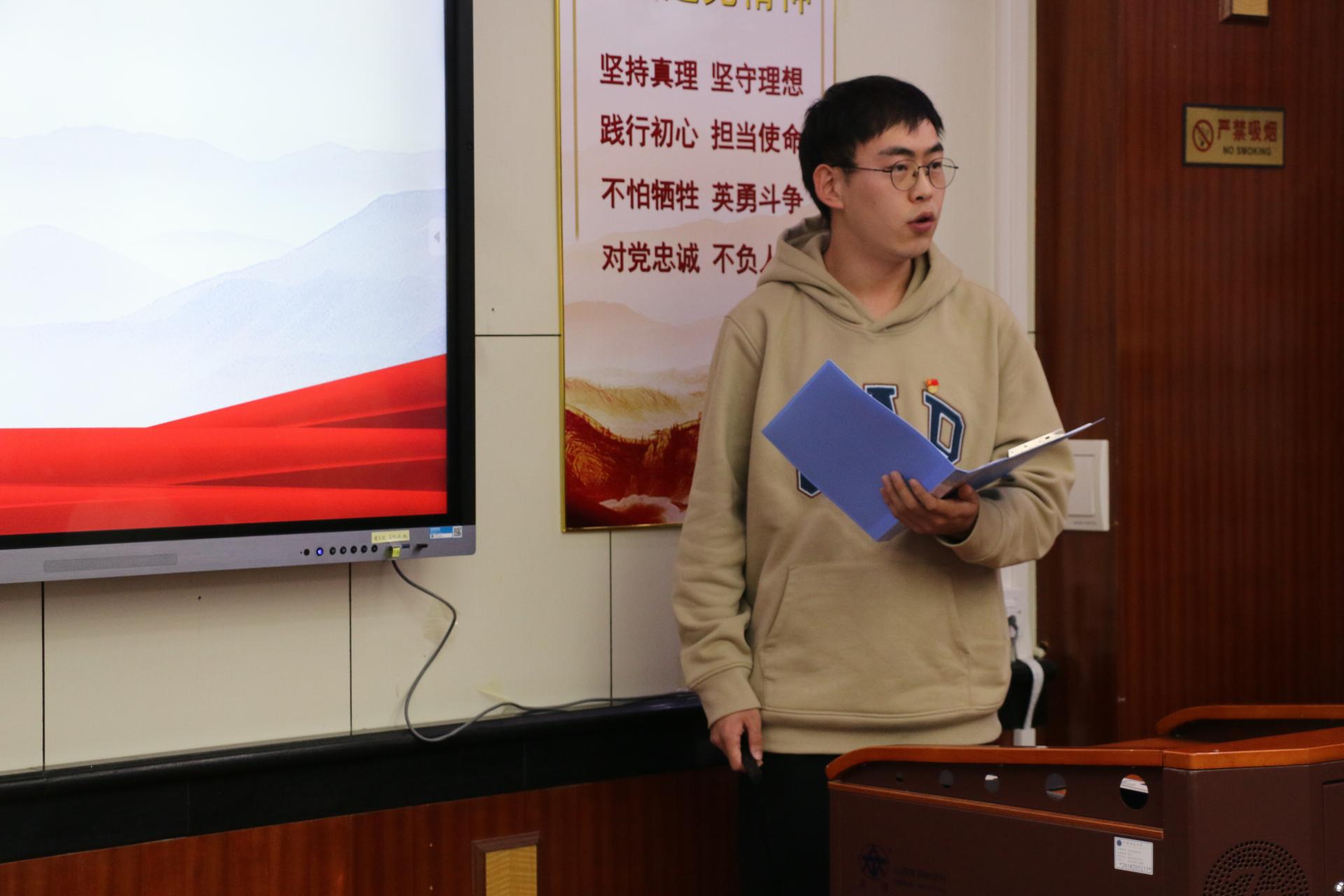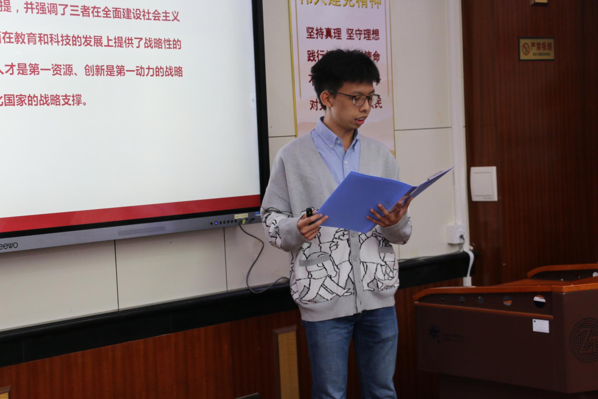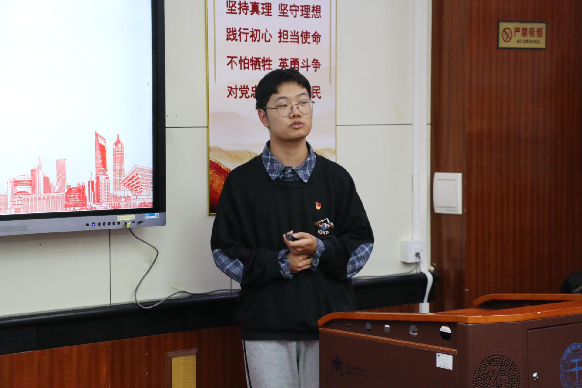 地球深部研究生党支部的杨鑫茂以《在历史中回望,从新时代出发》为题,围绕党的过去五年和新时代十年伟大变革的重大意义,以小窥大,从自身家乡发展引入,生动展现了祖国十年间发生的翻天覆地的变化,回顾了在祖国发展各个阶段做出突出贡献的青年典型人物事迹,并对站在新的历史起点的新时代青年提出了号召,鼓励广大学生党员勇担时代重任,志存高远,坚定向前。
