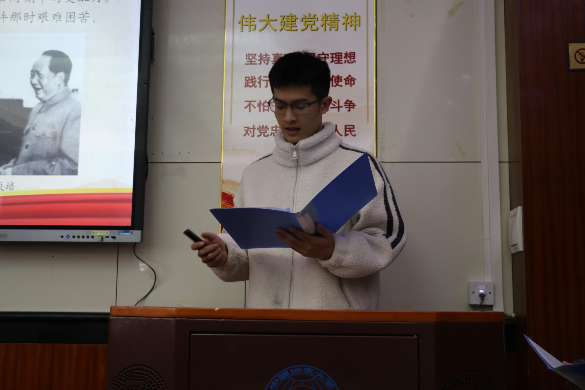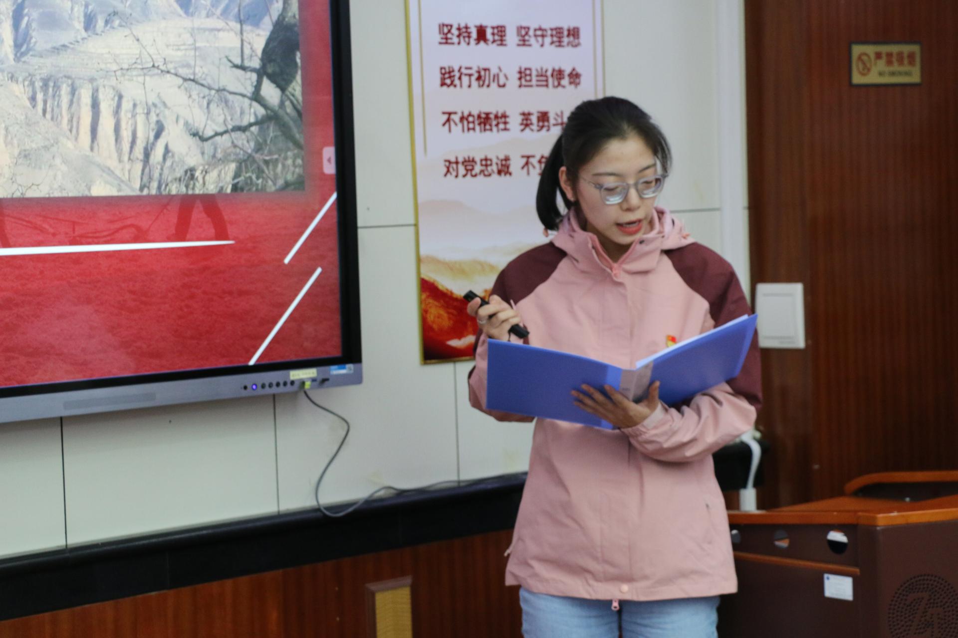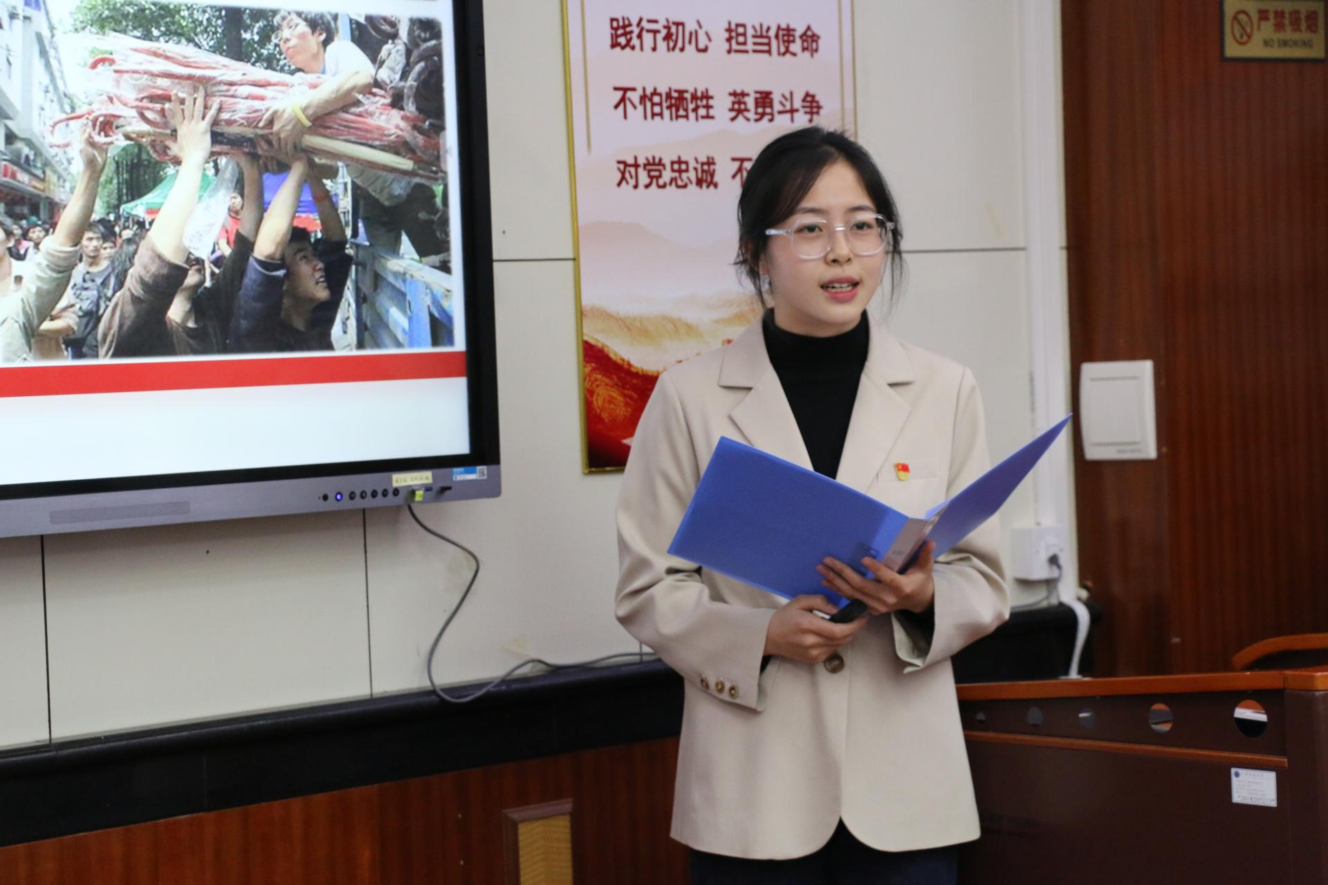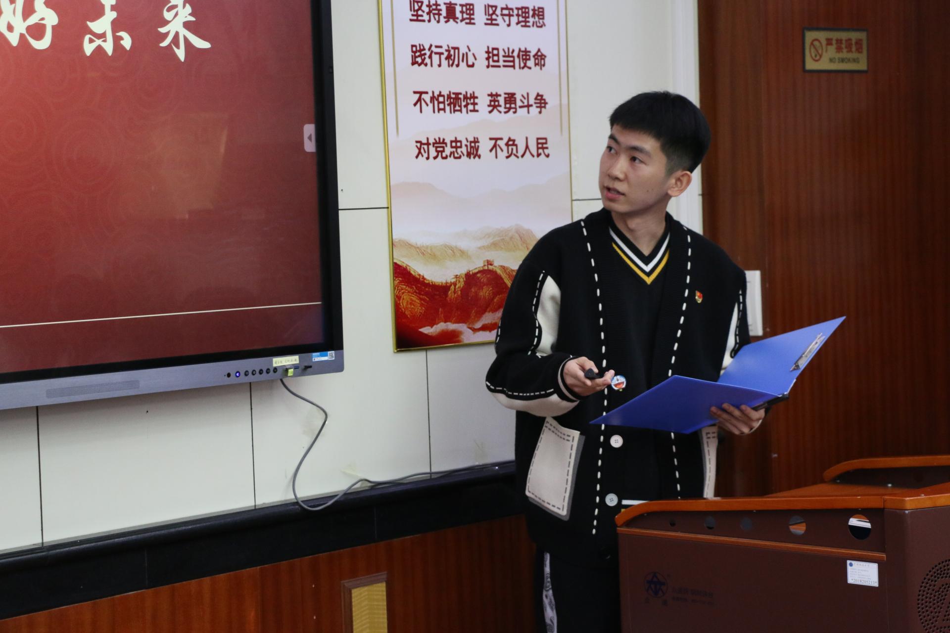 地球深部研究生党支部的杨鑫茂以《在历史中回望,从新时代出发》为题,围绕党的过去五年和新时代十年伟大变革的重大意义,以小窥大,从自身家乡发展引入,生动展现了祖国十年间发生的翻天覆地的变化,回顾了在祖国发展各个阶段做出突出贡献的青年典型人物事迹,并对站在新的历史起点的新时代青年提出了号召,鼓励广大学生党员勇担时代重任,志存高远,坚定向前。