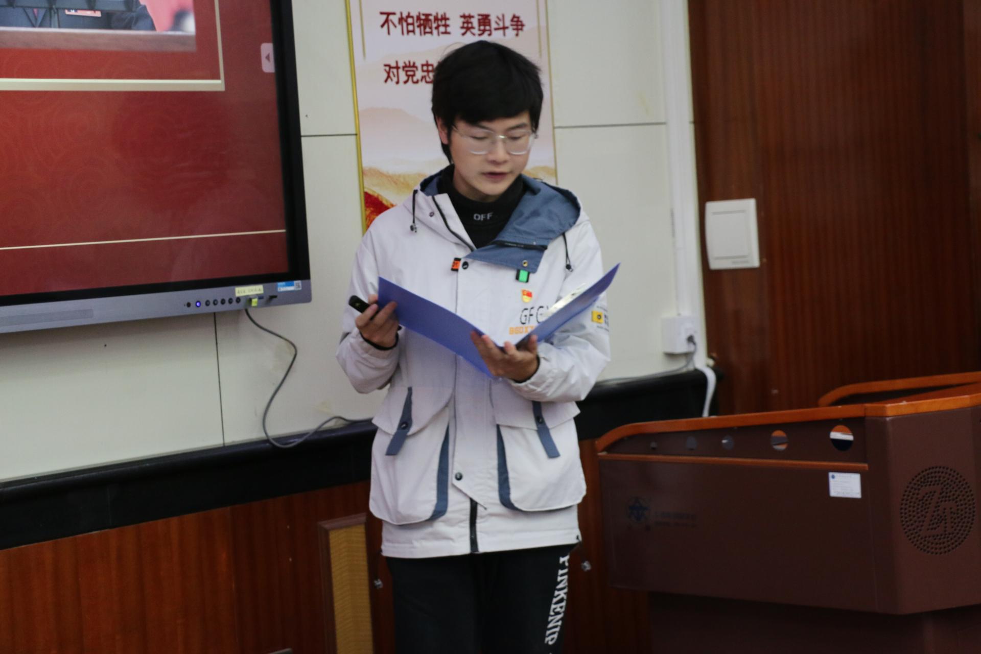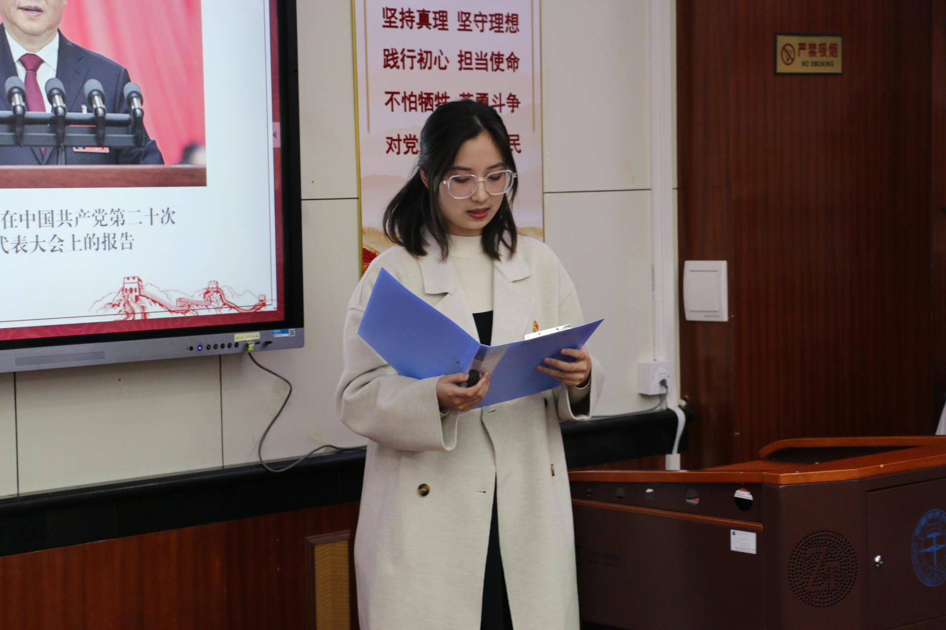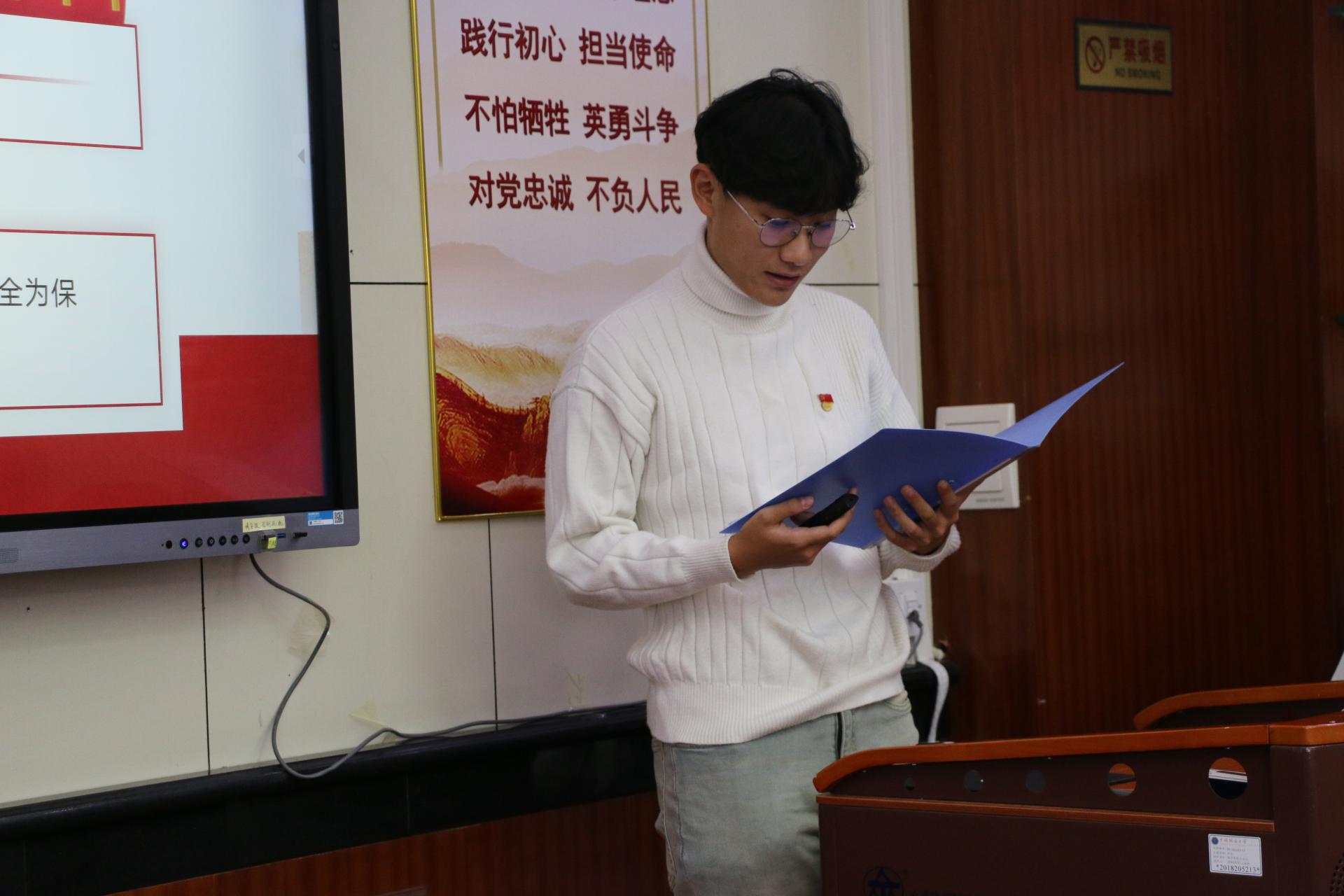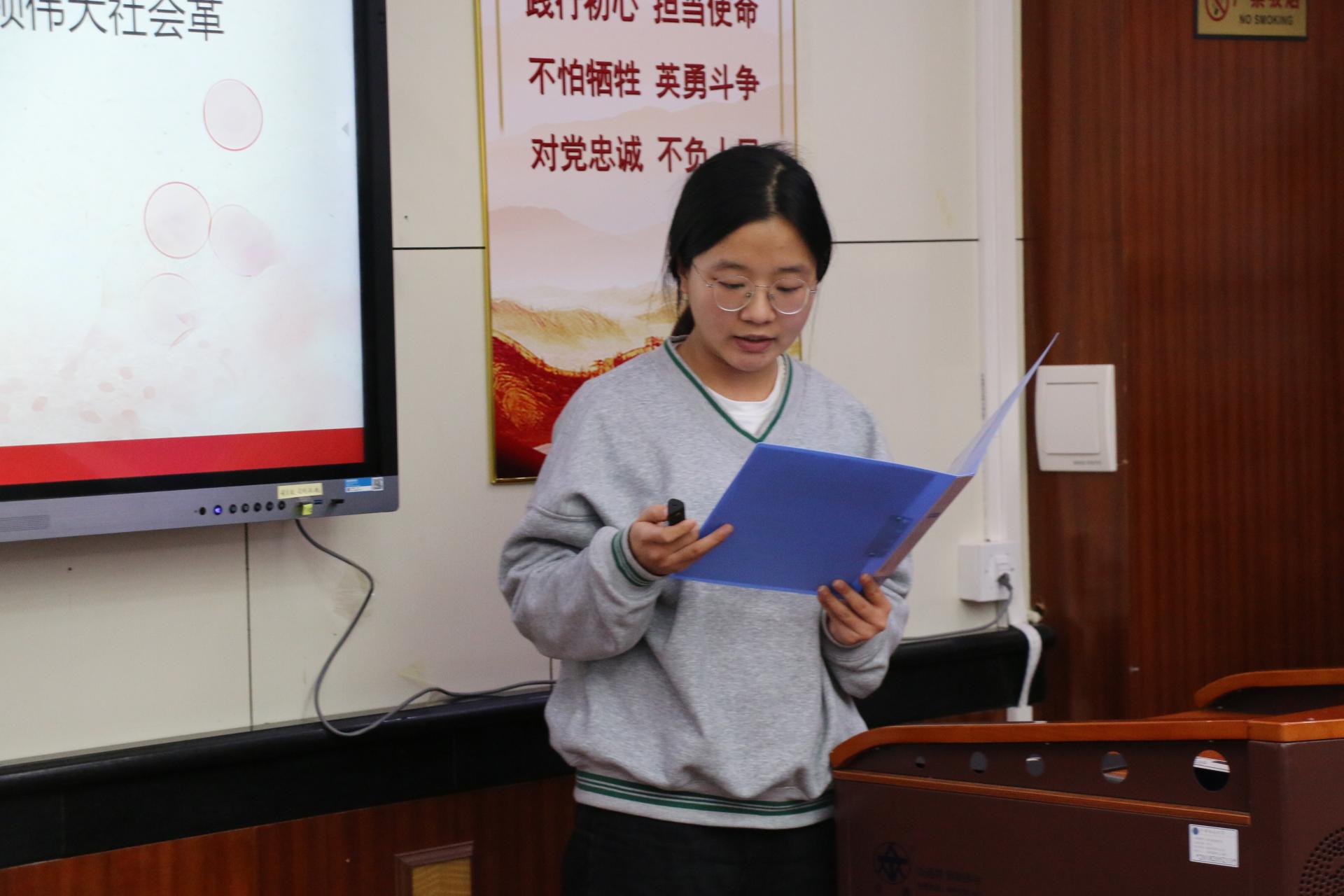 地球深部研究生党支部的杨鑫茂以《在历史中回望,从新时代出发》为题,围绕党的过去五年和新时代十年伟大变革的重大意义,以小窥大,从自身家乡发展引入,生动展现了祖国十年间发生的翻天覆地的变化,回顾了在祖国发展各个阶段做出突出贡献的青年典型人物事迹,并对站在新的历史起点的新时代青年提出了号召,鼓励广大学生党员勇担时代重任,志存高远,坚定向前。