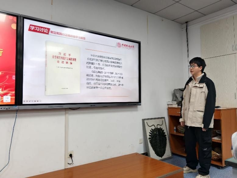 为深入学习贯彻全国两会精神,扎实开展树立和践行正确政绩观学习教育,激励广大党员在新时代强国建设中担当作为,2026年3月26日下午,地球与行星科学学院地球生物学系党支部与金钉子党支部在主楼604教室联合举办3月主题党日活动。活动特邀第十三届、十四届全国政协委员童金南教授出席并解读2026年全国两会精神,01G241班本科生列席会议。主题党日由地球生物学系党支部书记叶琴同志主持。